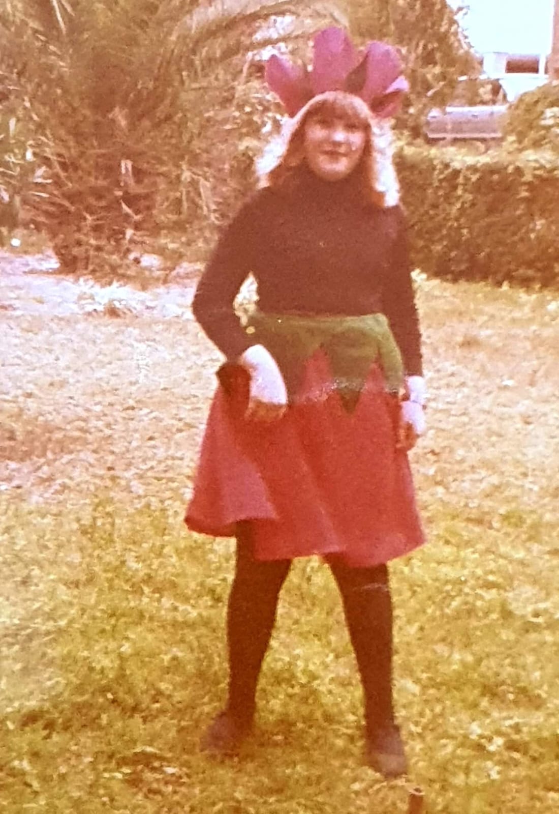 בת 9.5, נרגשת, לבושה בתחפושת הכל- כך מיוחדת שאמא תפרה לה.